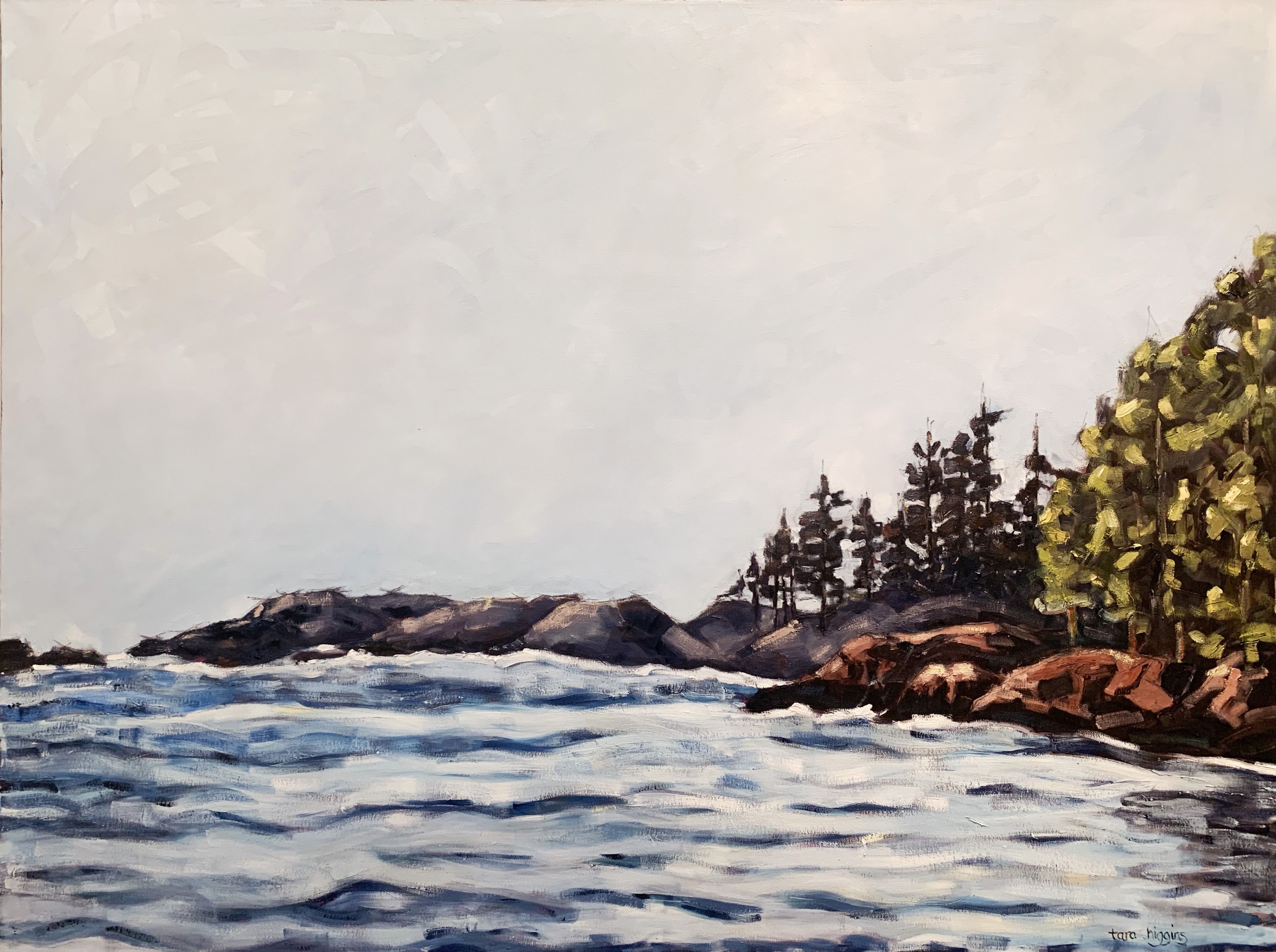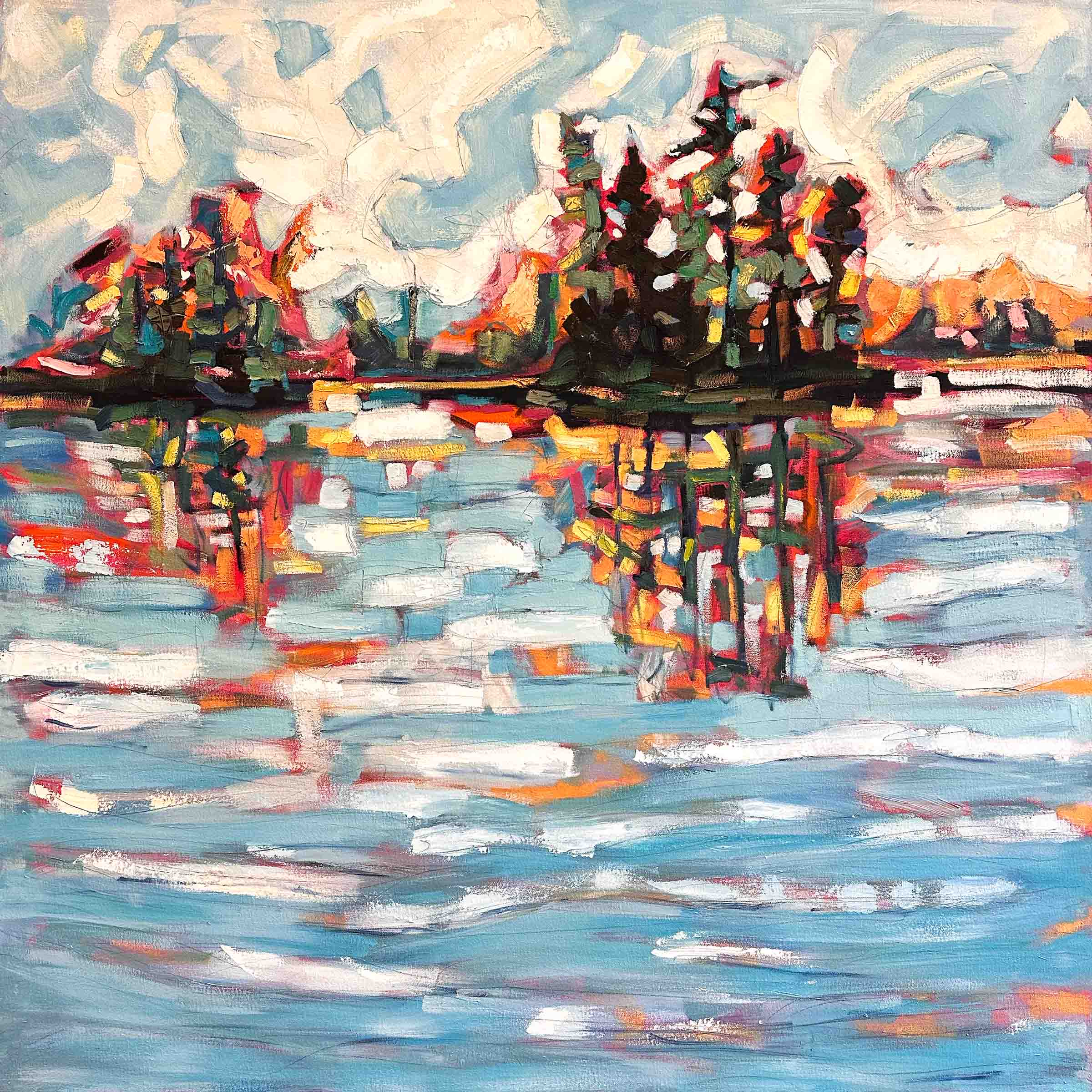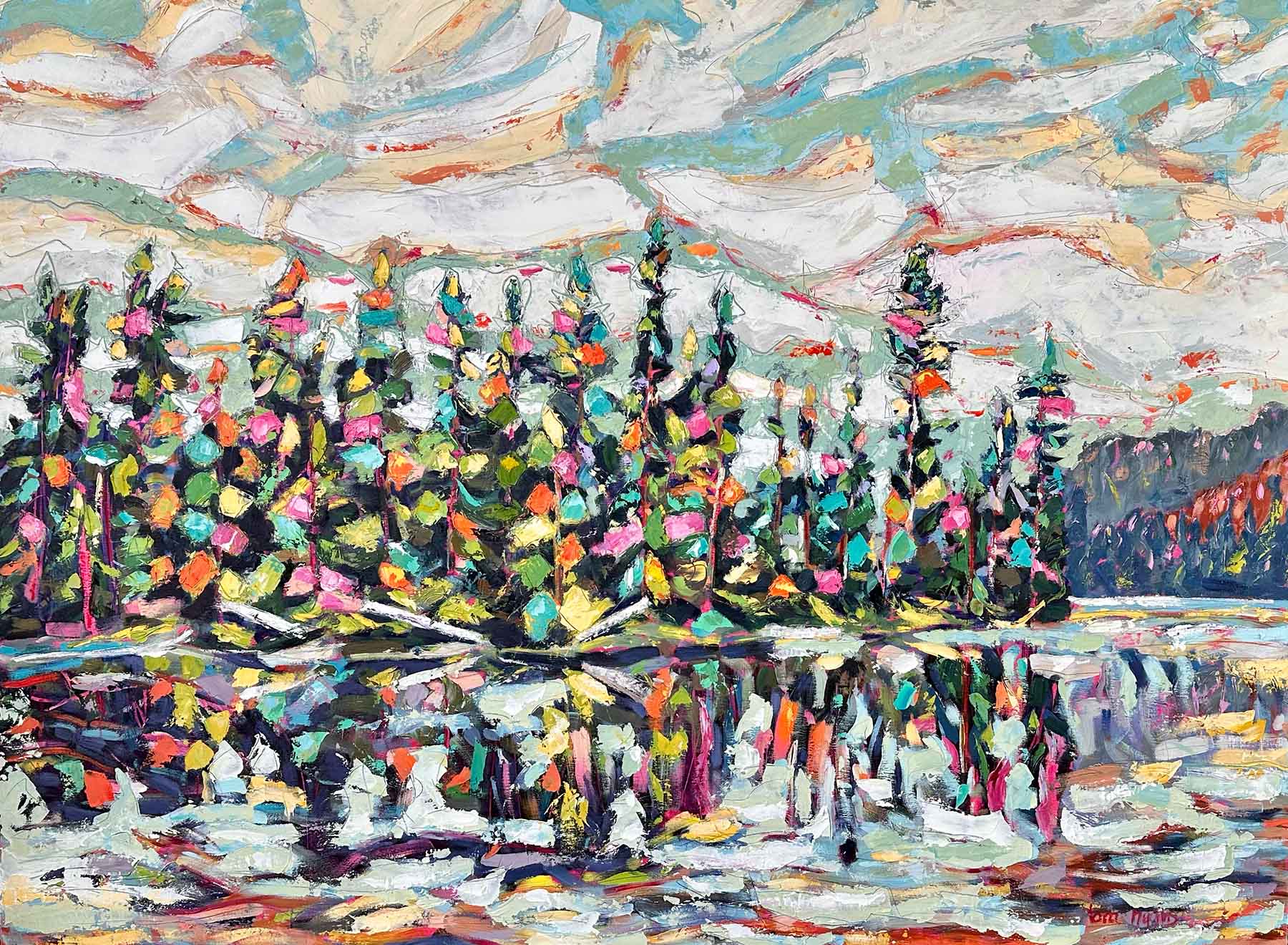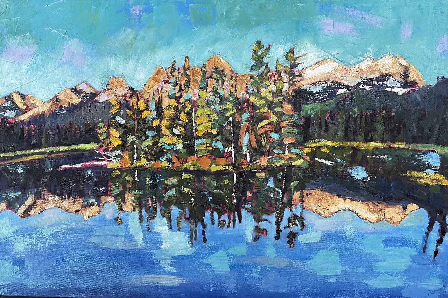 Leaning heavily on the Canadian Rockies and road trips for inspiration Tara's landscapes draw you into the moment. Bold brushstrokes and expressive uses of colour convey the story she is telling, which are hinted at in the titles of each piece.